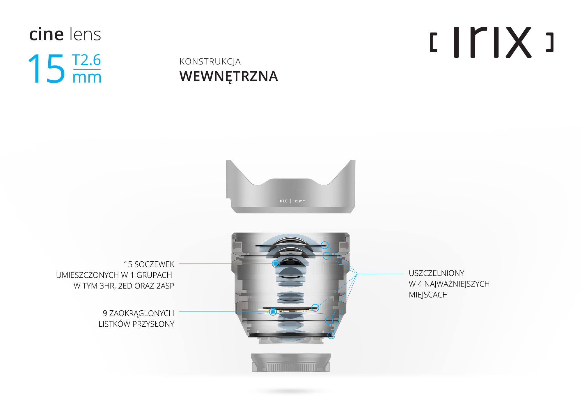 Irix Cine 15 mm to obiektyw pełnoklatkowy (43,3 mm), obejmujący pełną klatkę 35, Super 35, Red Dragon 6K, Arri Alexa, APS-C, MFT, Super 16 i inne matryce.